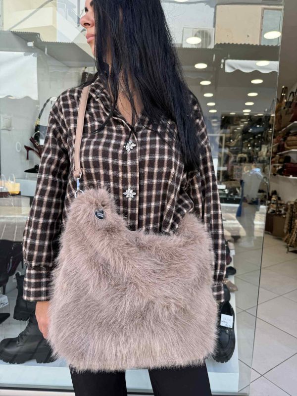 Τσάντα Ωμου Γούνινη Σκούρο Μπεζ
