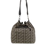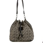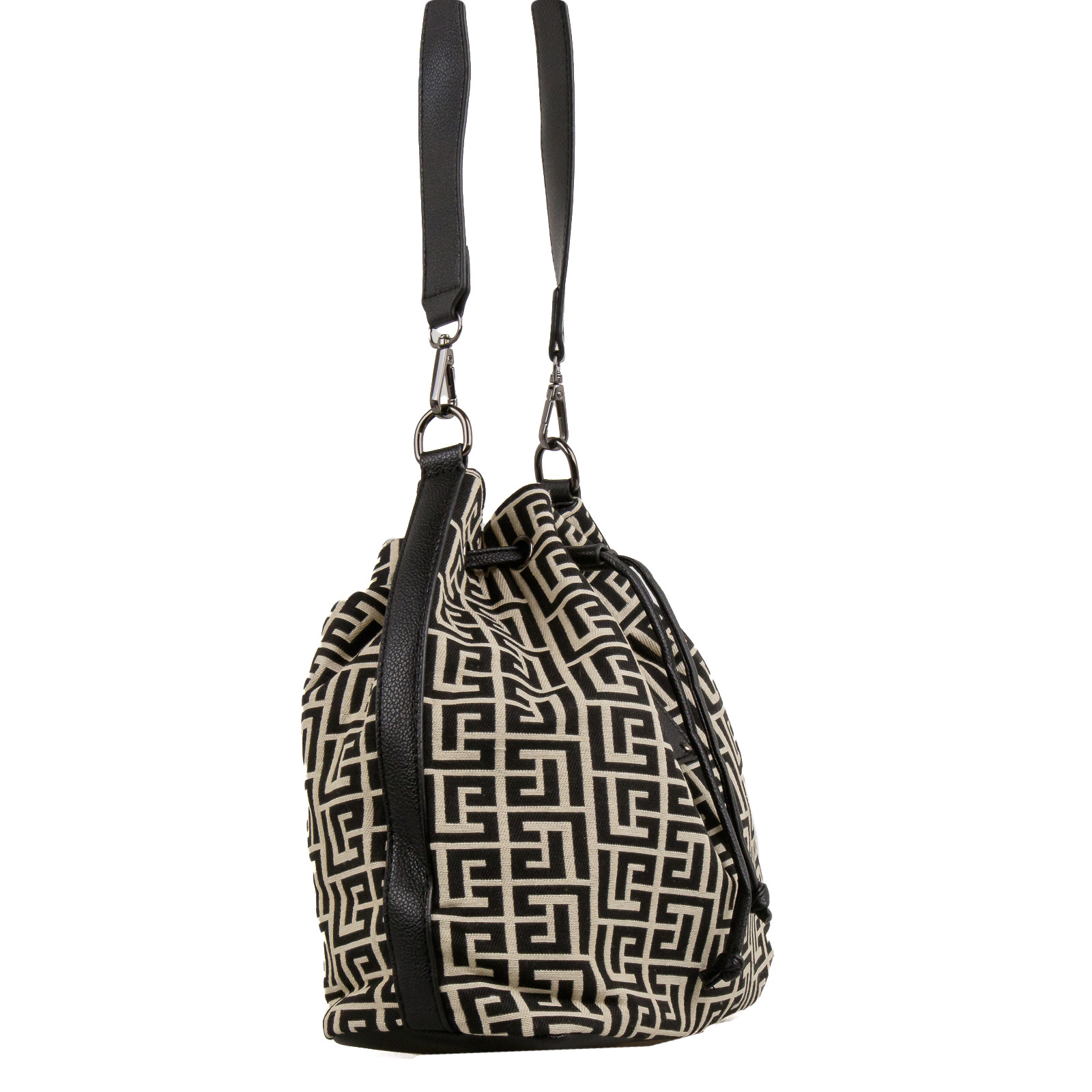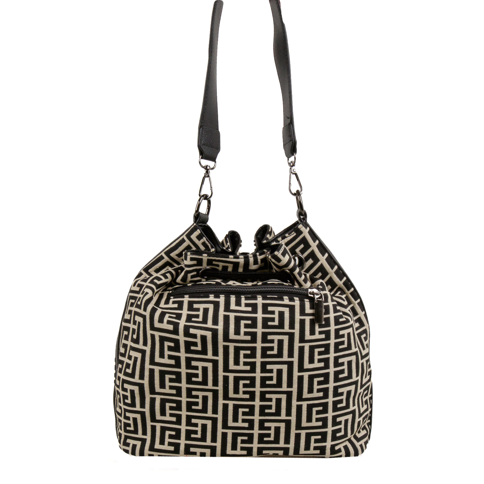 Δίχρωμη τσάντα πουγκί με prints, στις αποχρώσεις του μαύρου και του μπεζ. Διαθέτει ένα κοντό αποσπώμενο λουρί για να φορεθεί ως χειρός και ένα μακρύ αποσπώμενο για να φορεθεί στον ώμο ή χιαστί. Εσωτερικά έχει μία κεντρική θήκη με δύο βοηθητικές, ενώ εξωτερικά έχει μία βοηθητική στο πίσω μέρος, για μικροαντικείμενα. Κλείνει με σούρωμα. Μοναδική επιλογή που θα κλέψει τις εντυπώσεις!
