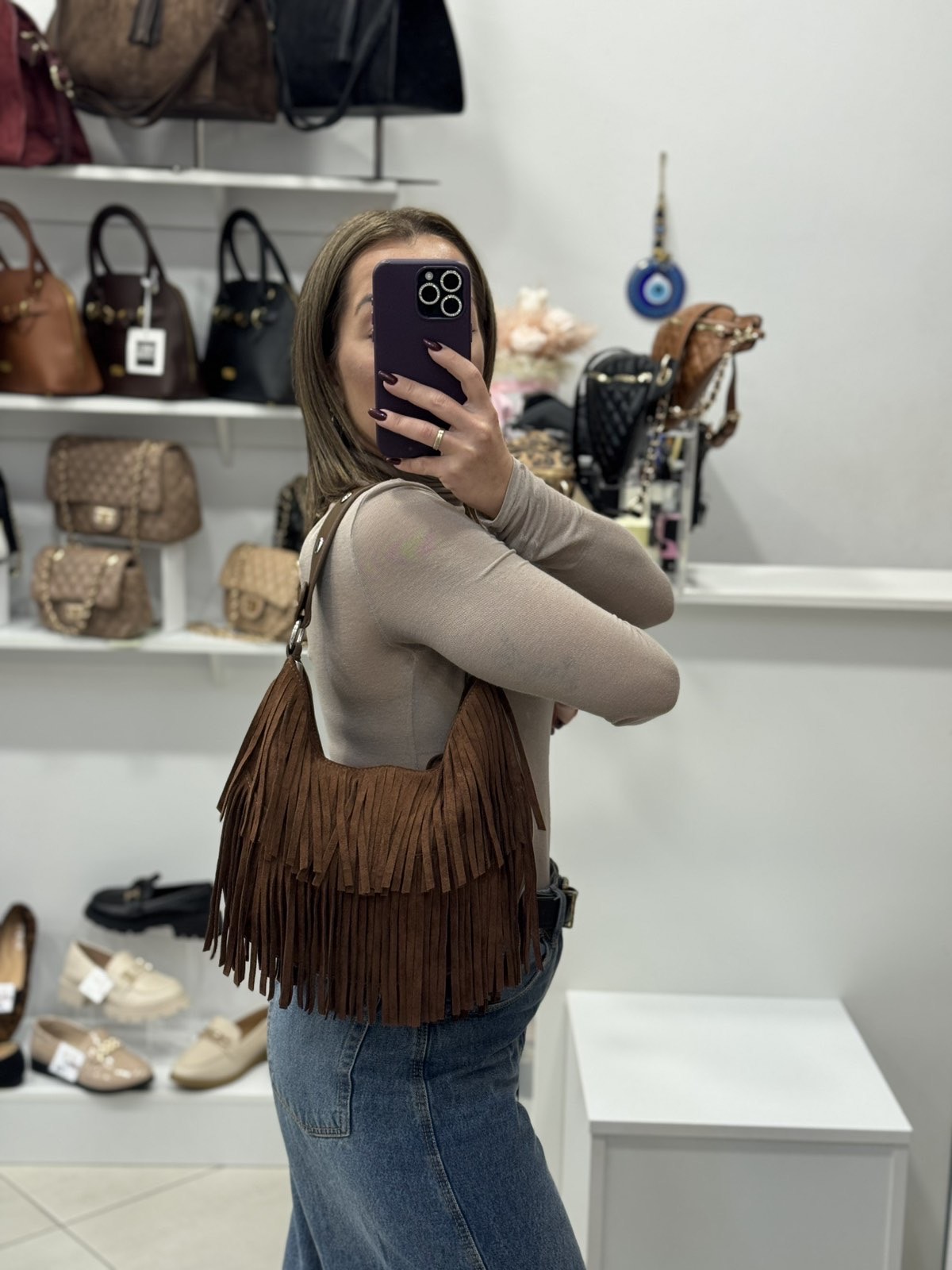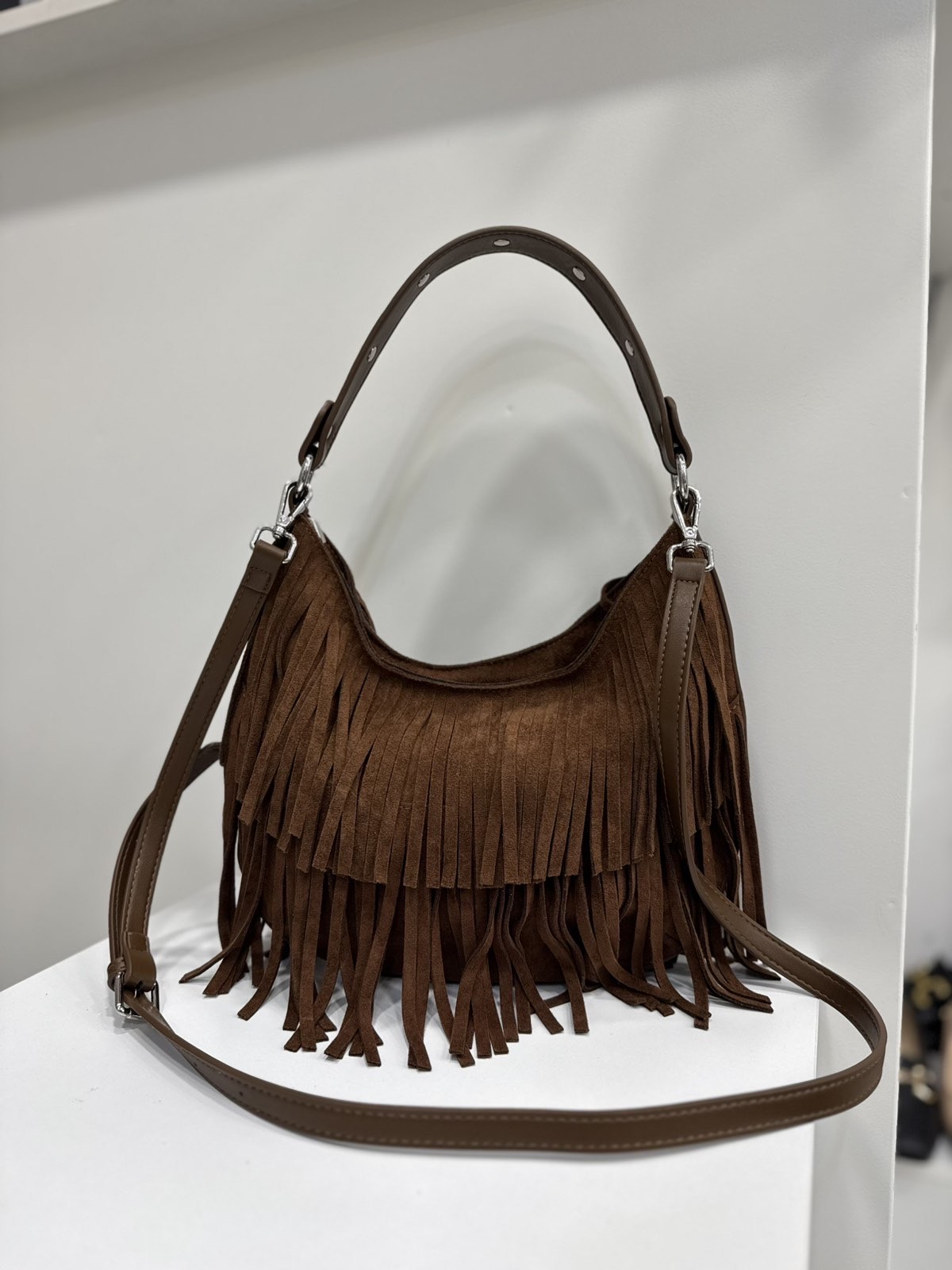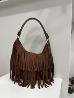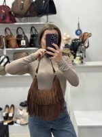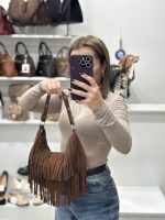 Σουέτ τσάντα με κρόσσια. Διαθέτει αποσπώμενο λουράκι, για να μπορεί να φορεθεί στον ώμο ή χιαστί. Εσωτερικά έχει μια κεντρική θήκη με δύο βοηθητικές για κλειδιά ή μικροαντικείμενα. Κλείνει με φερμουάρ. Μοναδική επιλογή για στυλάτες εμφανίσεις, όλες τις ώρες της ημέρας!
