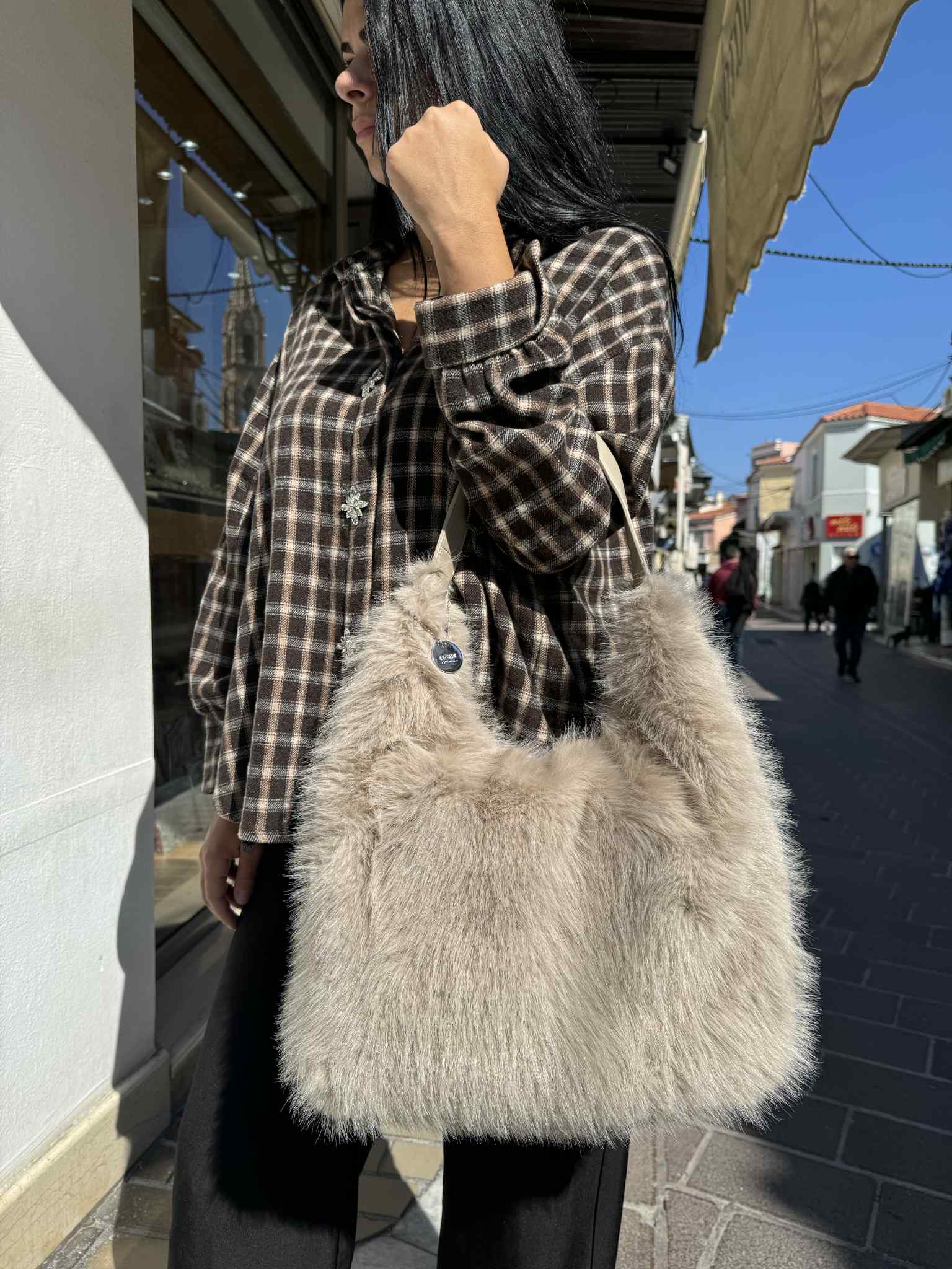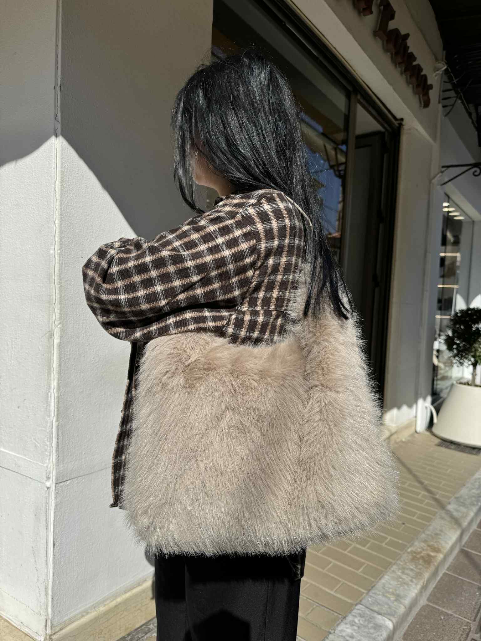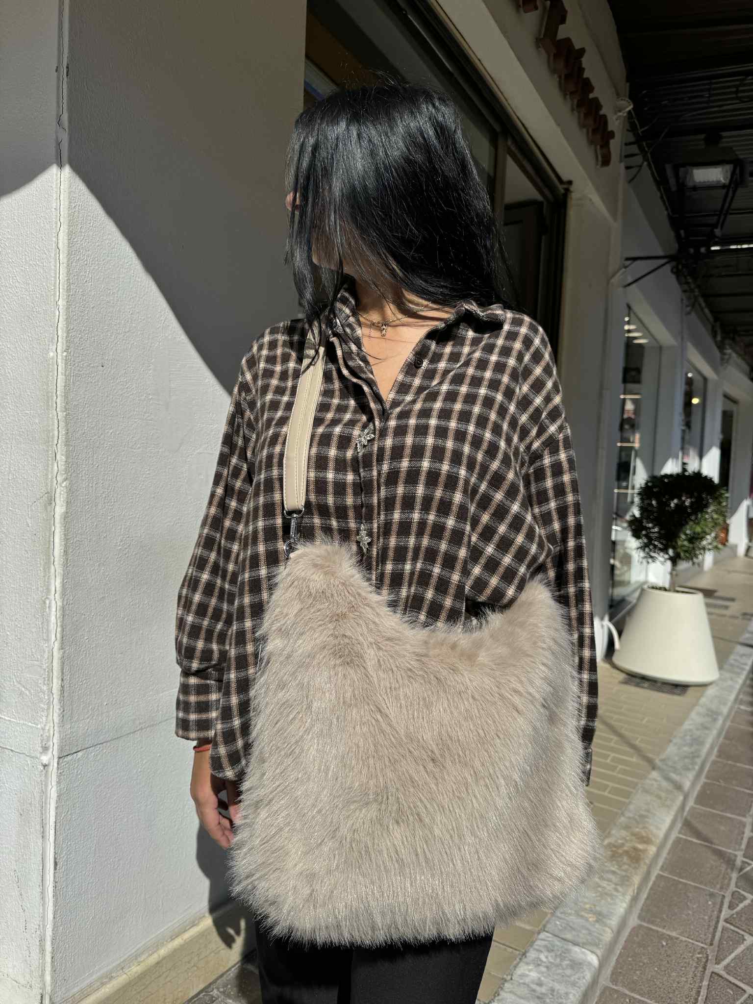 Τσάντα Ωμου Γούνινη Μπεζ