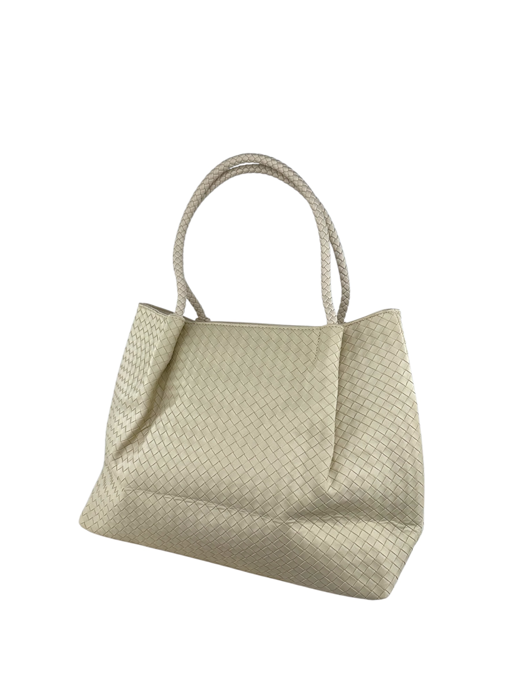 Μπεζ τσάντα ώμου με πλεκτό σχέδιο. Κλείνει με φερμουάρ, διαθέτει δυο θήκες, η μία με φερμουάρ. Ένα μοντέρνο αξεσουάρ με άνετους αποθηκευτικούς χώρους για να μεταφέρεις τα προσωπικά σου αντικείμενα με στιλ.