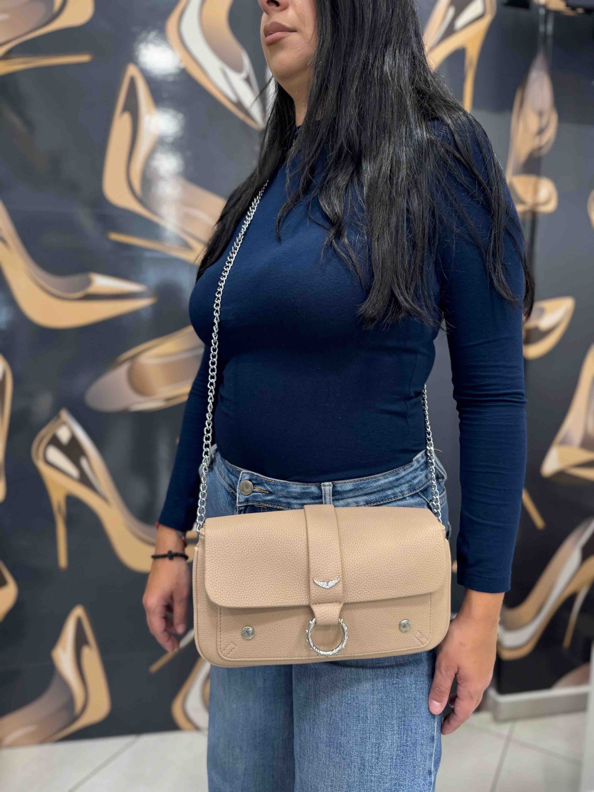 Διαθέτει ασημί λεπτομέρειες, και διακοσμητικό με strass. Έχει αποσπώμενη μακριά αλυσίδα για να κρατηθεί στον ώμο ή χιαστί. Εσωτερικά έχει δύο ξεχωριστές κεντρικές θήκες για κλειδιά ή μικροαντικείμενα. Εξωτερικά έχει μια βοηθητική στο μπροστινό μέρος.