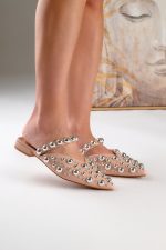 Mules με εντυπωσιακή σχεδίαση που συνδυάζουν κομψότητα και statement αισθητική. Κατασκευασμένα από ποιοτικά υλικά, διαθέτουν μαλακό πάτο για άνετη εφαρμογή και κλασική μυτερή μύτη που προσδίδει διαχρονικό στυλ. Οι πλούσιες ασημί μεταλλικές λεπτομέρειες δημιουργούν ένα μοντέρνο και λαμπερό αποτέλεσμα, καθιστώντας τα ιδανική επιλογή για βραδινές εξόδους ή κομψές εμφανίσεις. Διατίθενται σε δύο αποχρώσεις, μαύρο και nude, ώστε να ταιριάζουν με κάθε γκαρνταρόμπα.